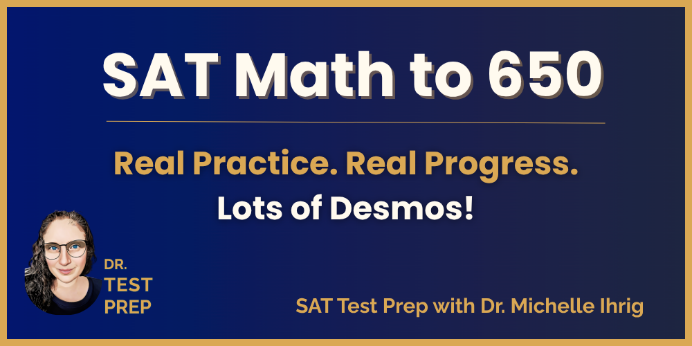 The SAT Math to 650 course is built for students who want clear, direct instruction — not shortcuts. In eight focused units, you’ll review the most frequently tested SAT math topics and learn how to approach each one using the Desmos calculator with confidence. Every lesson is taught by Dr. Michelle Ihrig (Dr. Test Prep), who shows you how to think through problems, check your reasoning, and use Desmos to your advantage. No tricks. No wasted steps. Just real math, real strategy, and real results — so you can walk into the SAT ready to earn your next score jump.
